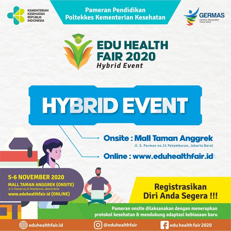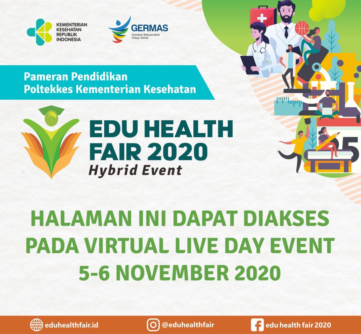 Edu Health Fair 2020 merupakan kegiatan pameran yang diselenggarakan oleh Badan Pengembangan dan Pemberdayaan SDM (BPPSDM) dengan tema “Poltekkes Kemenkes 4.0: Menembus Batas dan Produktif di Era Adaptasi Kebiasaan Baru”. Kegiatan ini diselenggarakan sebagai upaya untuk memperkenalkan dan mempromosikan potensi besar yang dimiliki oleh Lembaga Pendidikan di bawah naungan Kementerian Kesehatan. Berbagai kegiatan dilaksanakan di Edu Health Fair 2020, diantaranya adalah Pemeran Lembaga Pendidikan, Pameran Produk Kesehatan, Talkshow/Seminar dan berbagai kompetisi/lomba termasuk salah satunya lomba poster infografis.